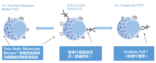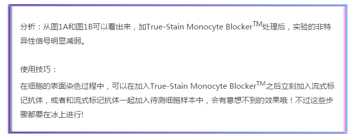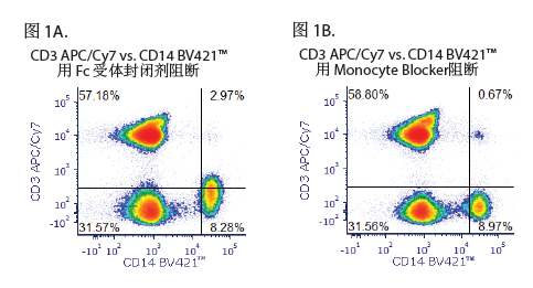 圖1A-B分別為TruStain FcXTM阻斷和True-Stain Monocyte BlockerTM阻斷后的CD14 BV421TM和CD3 APC /Cy7共染結(jié)果圖。