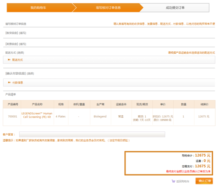 點(diǎn)擊購物車頁面的“結(jié)算”進(jìn)入填寫訂單信息的頁面,在此頁面請(qǐng)認(rèn)真填寫,收貨地址、發(fā)票信息、配送方式、支付方式等信息。點(diǎn)擊“確認(rèn)訂單”即可生成訂單。