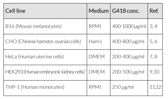 InvivoGen建議的工作濃度:G418通常以400 μg/ ml的濃度使用。當(dāng)然仍需要為您的細(xì)胞確定最佳濃度。下面列出了常見哺乳動(dòng)物細(xì)胞使用G418篩選的濃度(參見下表)。