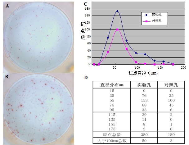 由于有了充足的信息與理由,我們可以在最后斑點計數(shù)的時候,把斑點直徑的閾值設(shè)定為100μm:我們只計數(shù)大于100μm的斑點,小于100μm的斑點不予計數(shù)。這樣負(fù)對照孔與實驗孔的最終結(jié)果為3:50,相差有17倍!這比最初相差一倍的結(jié)果顯著得多。