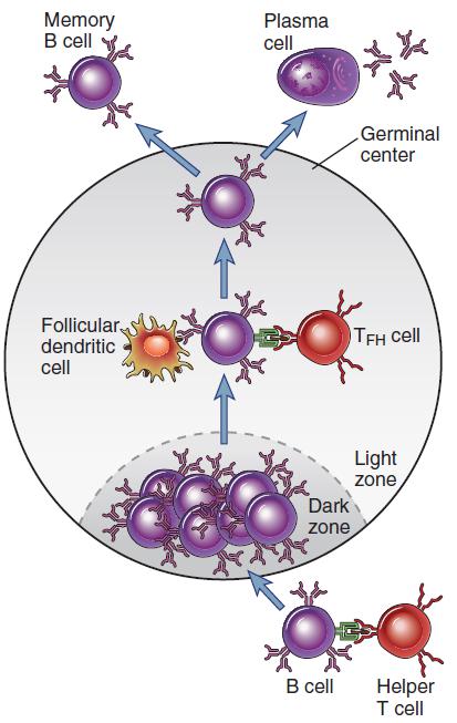 Tfh 細(xì)胞的主要作用是增加高親和力 B 細(xì)胞和長壽漿細(xì)胞的形成,并幫助他們轉(zhuǎn)移到發(fā)生中心(GC)。在接受抗原刺激后,初始 B 細(xì)胞首次移動到 T 細(xì)胞區(qū),且在來自 Tfh 細(xì)胞和抗原呈遞細(xì)胞的共刺激作用下開始活化并形成發(fā)生中心。當(dāng)發(fā)生中心的 B 細(xì)胞開始分化為漿細(xì)胞或記憶 B 細(xì)胞時, Bcl-6 會阻止 B 細(xì)胞的增殖,因為 Bcl-6 可以抑制 B 細(xì)胞活化基因的表達(dá),如 CD69、 STAT1 和 CD80 等,同時也會通過調(diào)節(jié) Prdm1 來抑制發(fā)生中心的 B 細(xì)胞向漿細(xì)胞分化。 Tfh 細(xì)胞通過 CD40 的作用致使 Bcl-6 轉(zhuǎn)錄沉默,從而促使發(fā)生中心 B 細(xì)胞存活和增殖。且在這一過程中,CD40L、PD-1、BAFF、IL-4 和 IL-21 等信號分子的參與也是必不可缺的。