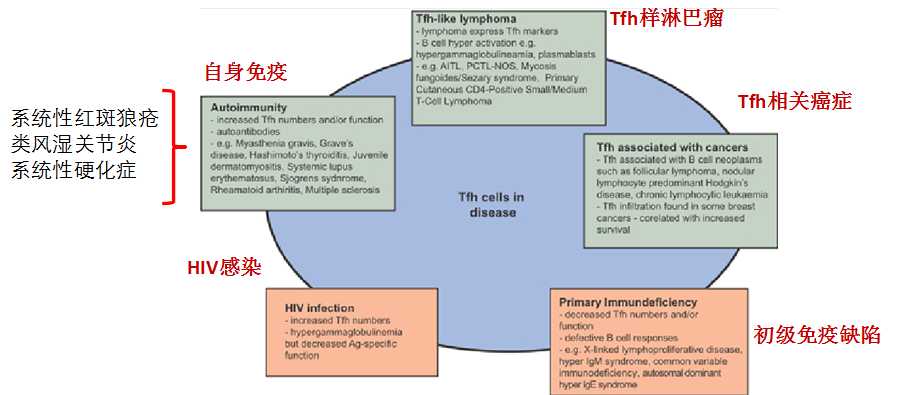 因此,基于 Tfh 細(xì)胞的功能特性,其與多種疾病密切相關(guān)。 Tfh 細(xì)胞及相關(guān)分子的缺陷會導(dǎo)致正常的 B 細(xì)胞反應(yīng)不能完成,產(chǎn)生體液免疫缺陷。相反, Tfh 功能亢進(jìn)也會導(dǎo)致病態(tài)的自身免疫反應(yīng),介導(dǎo)自身免疫病的發(fā)生。目前對 Tfh 的研究也主要集中在其與自身免疫疾病和 HIV 的關(guān)系上面。