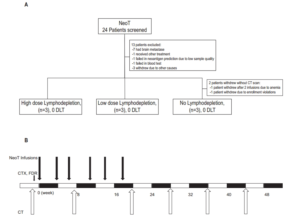 針對這些問題,中山大學(xué)徐瑞華團(tuán)隊在2023年6月10日發(fā)表了題為“A pilot study of lymphodepletion intensity for peripheral blood mononuclear cell-derived neoantigen-specific CD8+ T cell therapy in patients with advanced solid tumors”的研究論文。該研究開發(fā)了一種從癌癥患者的外周血單個核細(xì)胞(PBMCs)中產(chǎn)生個性化Neo-T(新抗原特異性CD8+ T細(xì)胞)的方法。作者建立了一個流程,包括通過生物信息學(xué)分析預(yù)測新抗原,并在25天內(nèi)大規(guī)模擴(kuò)增新抗原特異性T細(xì)胞。為了評估Neo-T治療的臨床療效并確定Neo-T治療的最佳淋巴細(xì)胞耗竭強(qiáng)度,作者進(jìn)行了一項首次在人體中使用氟達(dá)拉濱和環(huán)磷酰胺增加劑量的Neo-T治療的研究。該研究是一項開放標(biāo)簽I期臨床試驗(NCT02959905),包括標(biāo)準(zhǔn)治療難治的局部晚期或轉(zhuǎn)移性實體瘤患者。