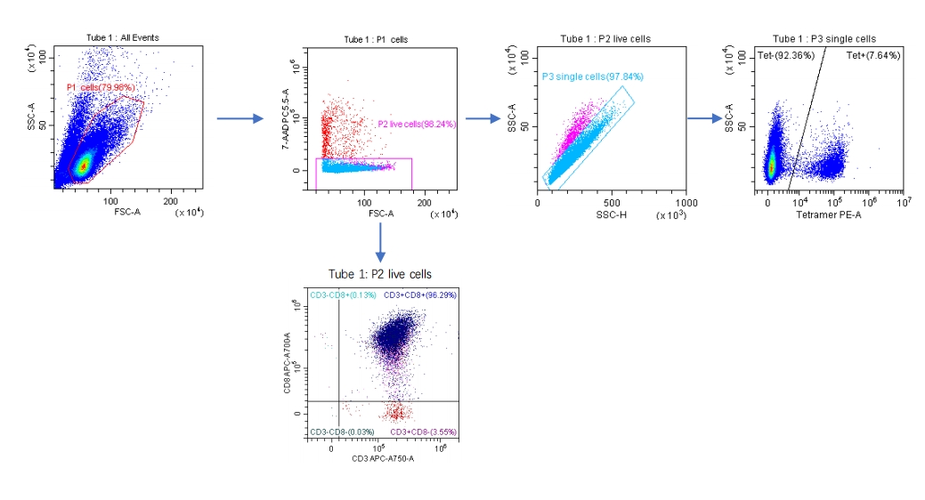 5、使用流式細(xì)胞儀對細(xì)胞進(jìn)行分析,基于DAPI對活細(xì)胞圈門,并對“CD8+ pMHC -四聚體+細(xì)胞”進(jìn)行分類;
