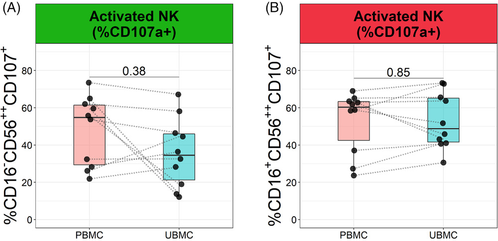 為了比較CD16-CD56++和CD16+CD56++細胞在胎盤床和外周血中的活化狀態(tài),本文檢測了細胞表面脫顆粒標志物CD107a的表達。胎盤床血中活化CD16-CD56++細胞的百分比與外周血相當(分別為35.87 ± 5.84%和47.84 ± 5.91%)(圖3A)。同樣,胎盤床血中活化CD16+CD56+細胞的百分比與外周血相似(分別為52.86 ± 4.74%和52.76 ± 5.29%)(圖3B)。