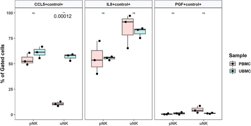 與外周血白細胞相比,胎盤床樣品中的CD16-CD56++NK細胞明顯表達更高的CCL5 mRNA(圖4)。另一方面,胎盤床和外周血中CD16+CD56++細胞表達的RANTES mRNA水平相似。此外,在胎盤床和外周血樣本中,兩種NK細胞中IL8和PGF mRNA水平均無差異。
