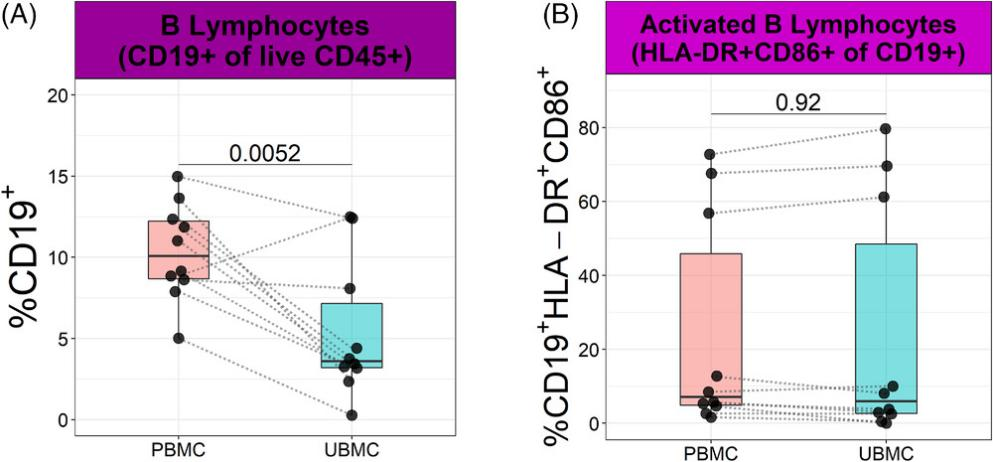 外周血B細胞(CD45+CD3-CD19+)占總活的CD45+白細胞比例高于胎盤床樣品(分別為10.34 ± 0.94%和5.36 ± 1.33%)(圖6A)。為了研究B細胞的活化狀態(tài),本文還檢測了CD86和人類白細胞抗原(HLA)II類分子HLA-DR的表達。外周血和胎盤床樣品中表達這兩種受體的B細胞比例相似(圖6B)。