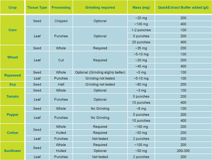 △圖1. 不同作物種子或葉片樣品預(yù)處理、研磨需求、起始重量及快提液所需量