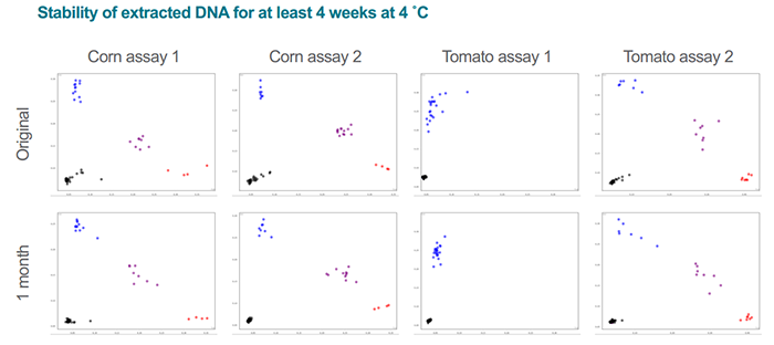 △圖2. 用QuickExtract從玉米和番茄中提取的DNA用KASP基因分型技術(shù)進(jìn)行聚類(Original),然后在4℃下儲存1個月,再將樣品進(jìn)行聚類(1month) ,實(shí)驗(yàn)結(jié)果完全一致。