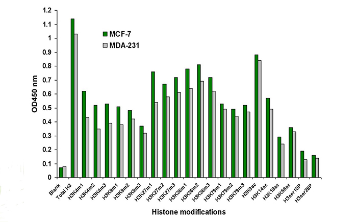 該試劑盒檢測H3修飾位點(diǎn):H3K4me1 、H3K4me2、H3K4me3、H3K9me1、H3K9me2 、H3K9me3、H3K27me1、H3K27me2、H3K27me3、H3K36me1、H3K36me2、H3K36me3、H3K79me1、H3K79me2、H3K79me3、H3K9ac、H3K14ac、H3K18ac、H3K27ac、H3K56ac、H3ser10P、H3cit、TotalH3