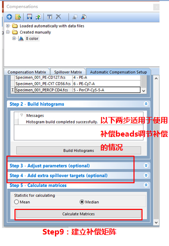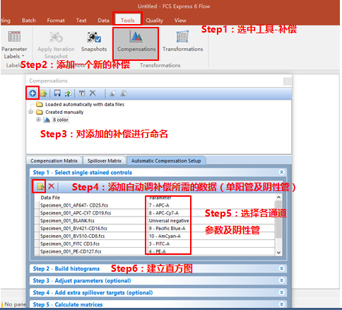 依次調(diào)整好各單管Control的Marker門的位置。此處不一一列舉?;氐窖a(bǔ)償界面。此處的3、4適用于使用補(bǔ)償beads調(diào)節(jié)補(bǔ)償?shù)那闆r(由于本次數(shù)據(jù)為細(xì)胞,此處不詳細(xì)列出,如對此步驟感興趣,可咨詢小達(dá)君)
