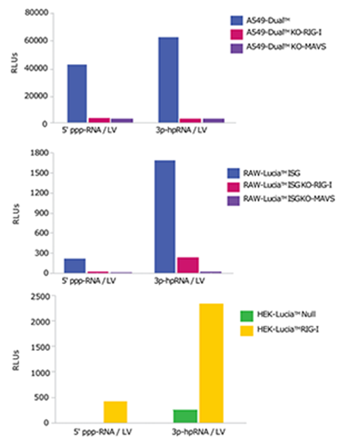 ISG對(duì)RIG-I配體的反應(yīng):使用300 ng/ml的5’ppp-dsRNA或30 ng/ml的3p-hpRNA刺激衍生自A549的細(xì)胞;使用1 μg/ml 5’ppp-dsRNA或3p-hpRNA刺激衍生自RAW和HEK293的細(xì)胞。經(jīng)過(guò)孵育過(guò)夜,可使用QUANTI-Luc?檢測(cè)上清中Lucia熒光素酶活性的相對(duì)光單位(RLUs)以測(cè)試ISG的反應(yīng)。