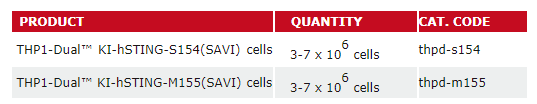 InvivoGen提供給一系列基于人源THP1單核細(xì)胞系的STING突變體的報(bào)告基因細(xì)胞株。其中,有兩款表達(dá)STING- associated vasculopathy with onset in infancy(SAVI)的功能獲得性突變體(S154 and M155)。SAVI患者在STING蛋白中顯示出單一突變,導(dǎo)致其持續(xù)激活和ISG的過(guò)度活化。S154是新生突變[1],M155是遺傳突變[2]。STING SAVI報(bào)告基因細(xì)胞株是篩選STING通路抑制劑便捷有力的工具。