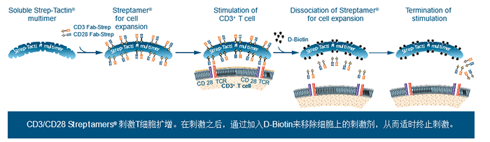Streptamers?應(yīng)用于T細胞擴增是目前T細胞擴增術(shù)中一項較新穎的技術(shù)。該技術(shù)的核心在于:將抗CD3和抗CD28的Fab-Streps結(jié)合到Strep-Tactin? 多聚體上,使它們形成可溶性的蛋白復(fù)合物。在刺激之后,通過加入D-Biotin來移除細胞上的刺激劑,從而適時終止刺激。