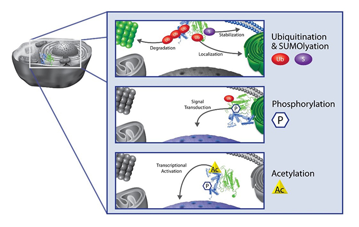 盡管目前已知的PTM的種類超過400種,但只有少數(shù)幾個被詳細研究過,主要包括甲基化、磷酸化、乙?;?、泛素化和SUMO化,它們被證明是幾乎所有細胞的關(guān)鍵調(diào)節(jié)因素,包括信號轉(zhuǎn)導(dǎo)、表觀遺傳學(xué)、基因和蛋白質(zhì)表達、蛋白質(zhì)穩(wěn)定性和定位以及細胞免疫。