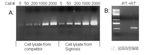 圖2 A: 比較Signosis與其他品牌的細胞裂解液。分別對裂解產物中的β-actin進行30個循環(huán)反轉錄PCR。