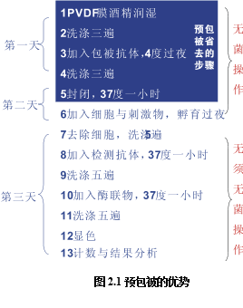 如圖2.1所示,預(yù)包被有著明顯的技術(shù)優(yōu)勢(shì)。PVDF板的ELISPOT試驗(yàn)一共需要3天時(shí)間,采用預(yù)包被板可以節(jié)省一天的時(shí)間,當(dāng)天處理細(xì)胞,當(dāng)天上板檢測(cè);未包被的檢測(cè)共有13步,預(yù)包被可以省掉其中的5步,并且這5部都是需要無(wú)菌操作的步驟,占整個(gè)無(wú)菌操作步驟的5/6。節(jié)省時(shí)間只是其一,由于減少了無(wú)菌操作的步驟,使得整個(gè)實(shí)驗(yàn)污染與出錯(cuò)的概率大大降低,提高了整體試驗(yàn)的成功率。