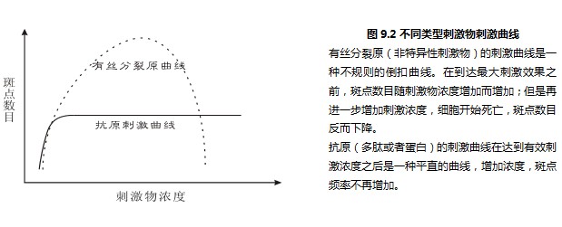 其一、非特異性的刺激物刺激效果不穩(wěn)定。如圖9.2所示,非特異性的刺激物(有絲分裂原Mitogen)的刺激曲線幾乎沒有平坦的部分。也就是說,刺激物的濃度有細(xì)微變化,馬上就會體現(xiàn)在刺激斑點(diǎn)數(shù)目的變化上了,這樣實驗結(jié)果很難完全重現(xiàn)。相反,抗原的刺激曲線非常平坦,只要達(dá)到有效刺激濃度,斑點(diǎn)頻率就不再變化。