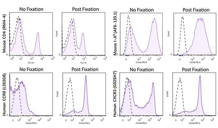 流式實(shí)驗(yàn)中,有一些情況我們希望或需要對樣本進(jìn)行預(yù)先固定處理,比如前文說過的傳染病人的樣本或者是需要檢測蛋白翻譯后修飾的樣本。對于需要預(yù)固定的樣本,首先需要考慮預(yù)先固定處理對檢測指標(biāo)的影響,有很多指標(biāo)先染色再固定和先固定再染色出來結(jié)果差異非常大,導(dǎo)致這些差異原因和指標(biāo)的類型、抗體的克隆號等因素都有關(guān)系。