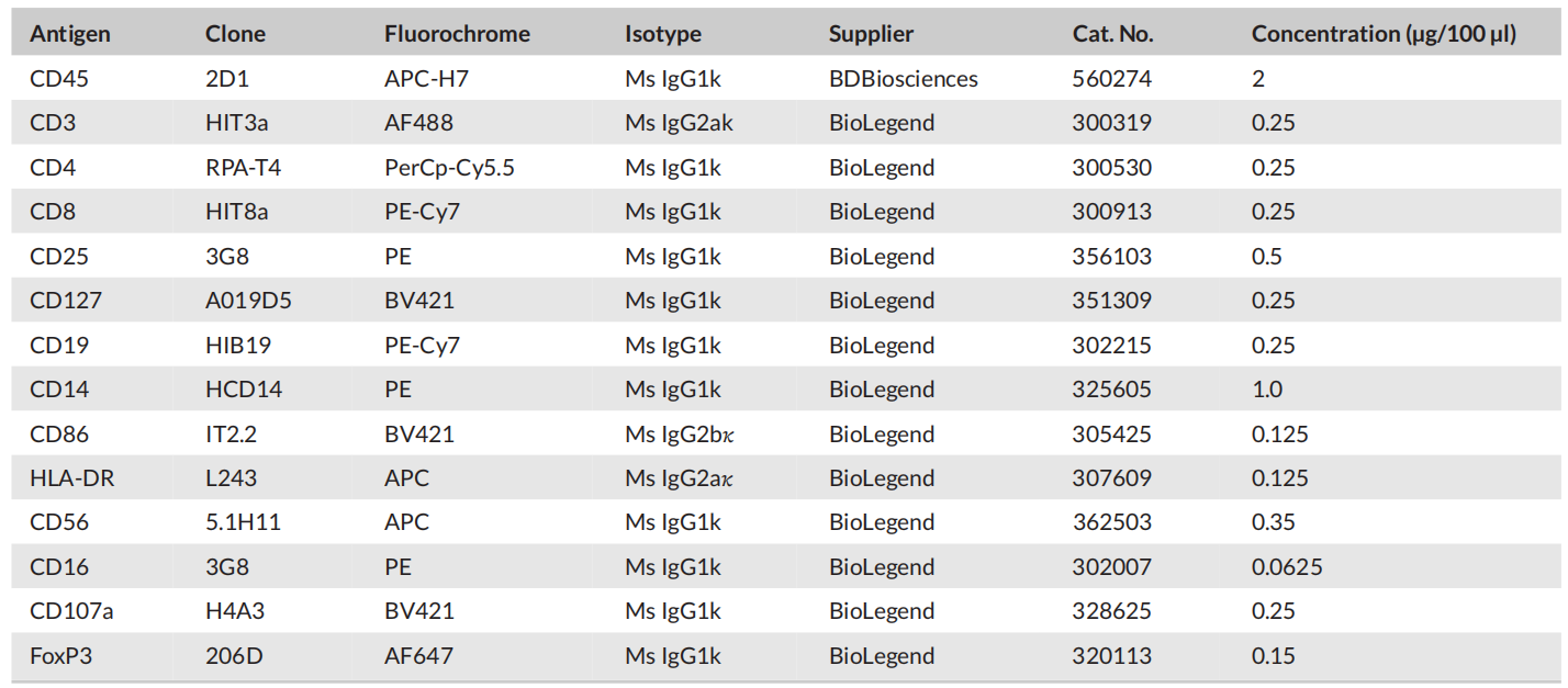 T regulatory細胞:CD45+CD3+CD4+CD8-CD25+FoxP3+CD127low