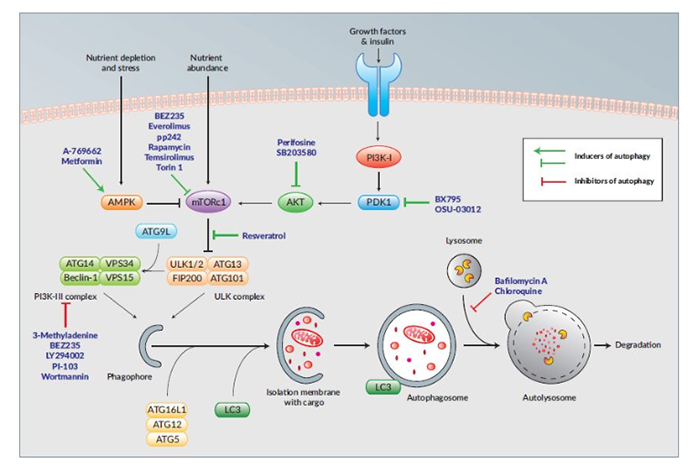 自噬是原生分解程序,由細胞內(nèi)應(yīng)激物(營養(yǎng)物和能量貧乏)引起。自噬由生成自噬體開始,這一步驟由一系列蛋白調(diào)控,包括VPS34的Ⅲ型磷脂酰基醇(PI)3激酶復合體,隨后與溶酶體的融合將自噬體酸化。自噬的阻斷有多種形式,例如Ⅲ型PI3激酶抑制劑可通過抑制自噬捕獲動作而阻斷自噬進程,或者用抑制溶酶體酸化的抑制劑阻止自噬溶酶體的形成和自噬降解。自噬進程是被縝密調(diào)控的。mTORC1,一種對營養(yǎng)物和生長因子敏感的激酶,是自噬的主要阻遏器。因此,mTORC1及其信號通路的抑制劑可誘導產(chǎn)生自噬。