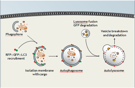 自噬通過(guò)溶酶體將胞漿物質(zhì)降解,是維持恒定程序的基本要素。研究自噬潮(autophagicflux)的關(guān)鍵蛋白是LC3(微管相關(guān)蛋白1輕鏈3)。在分離膜形成時(shí)胞漿中的LC3被招募并進(jìn)入自噬程序,此定位動(dòng)作被視為自噬膜的特征,用以檢測(cè)自噬的生成和發(fā)展。由LC3B融合一個(gè)綠色熒光蛋白(GFP)和一個(gè)紅色熒光蛋白(RFP)組成的嵌合蛋白 ,是檢測(cè)自噬過(guò)程的簡(jiǎn)單方法。自噬體的形成可被RFP-GFP-LC3標(biāo)記,顯示RFP和GFP雙信號(hào)。與溶酶體融合后,酸性環(huán)境可顯著降低GFP信號(hào),RFP信號(hào)卻保持穩(wěn)定。隨著自噬研究熱度的不斷提高,自噬報(bào)告基因細(xì)胞作為自噬過(guò)程研究的工具越來(lái)越多的受到廣大科研工作者的關(guān)注。